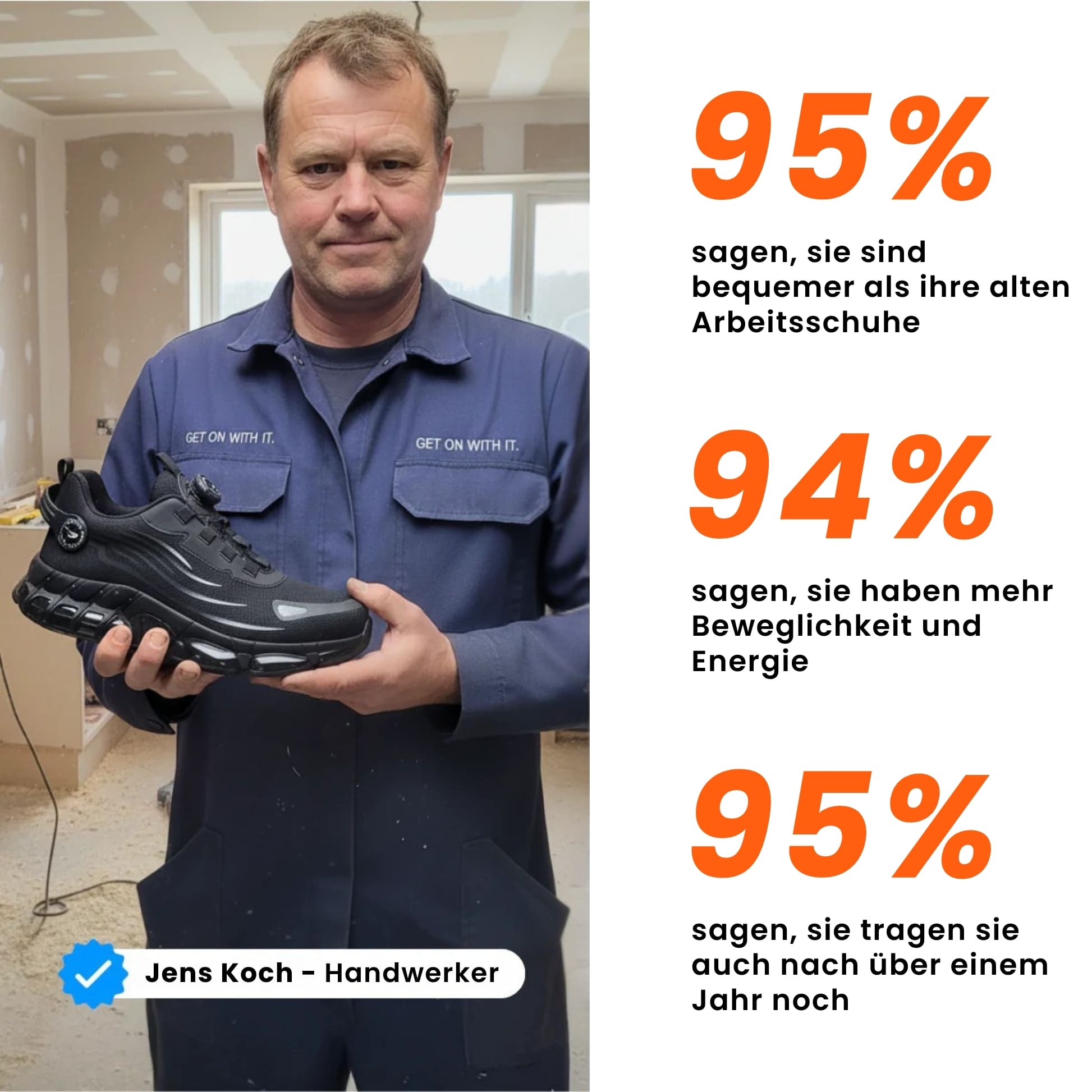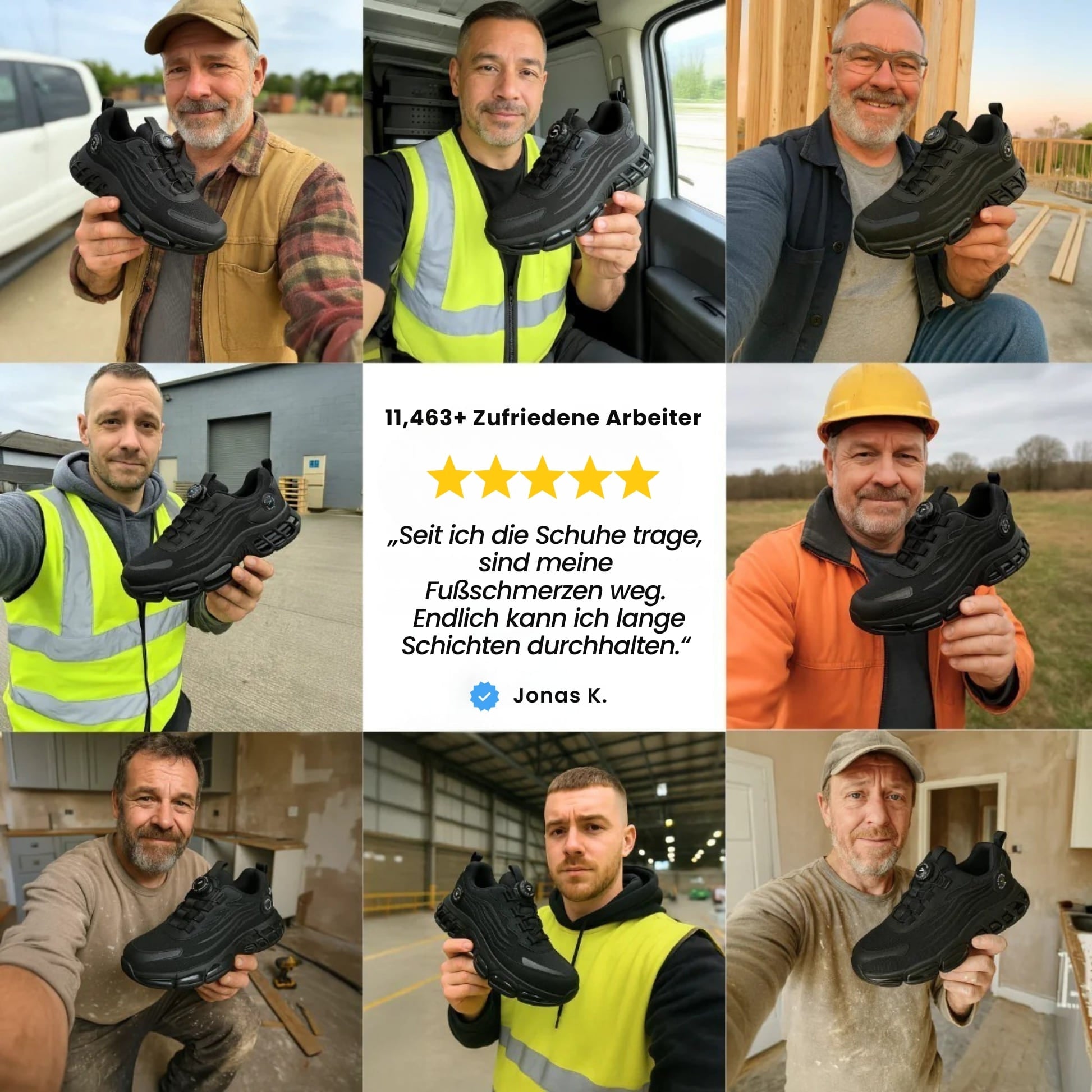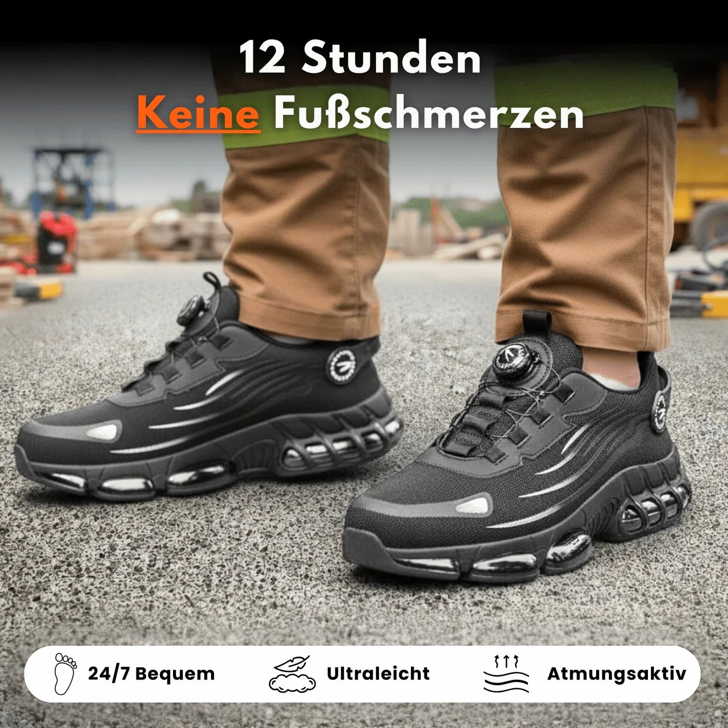 Egal ob Baustelle, Werkstatt oder Lager: Rutschfeste Sohlen sorgen für maximalen Halt, während Füße, Knie und Rücken spürbar entlastet werden – selbst nach 10–12 Stunden Arbeit.